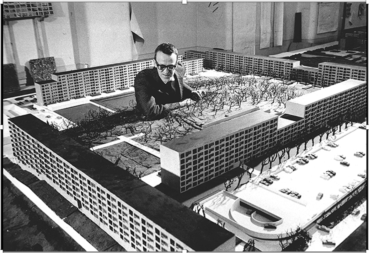 Stereotyp 2: Upprepning som produktionsanpassning och som retorik. Den unge Gunnar Werner på White arkitekter dyker upp i en modell av en del av Hammarkullen i slutet av 1960-talet. Han fick bära skulden för de förenklingar byggherren, här kommunala Bostadsbolaget, krävde. Pressfotografernas älsklingsvinkel blev arkitekten tillsammans med en modell. Foto: White arkitekter.